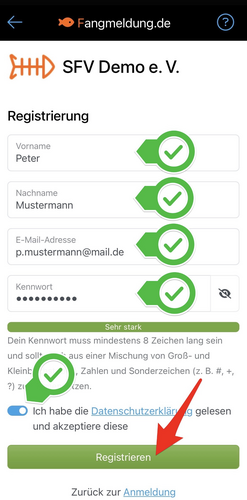 Je nachdem, wie die Einstellungen konfiguriert sind, könnte ein Registrierungscode oder eine Mitgliedsnummer erforderlich sein. Keine Sorge, diese Daten bekommst du ganz einfach von deinem Verein.